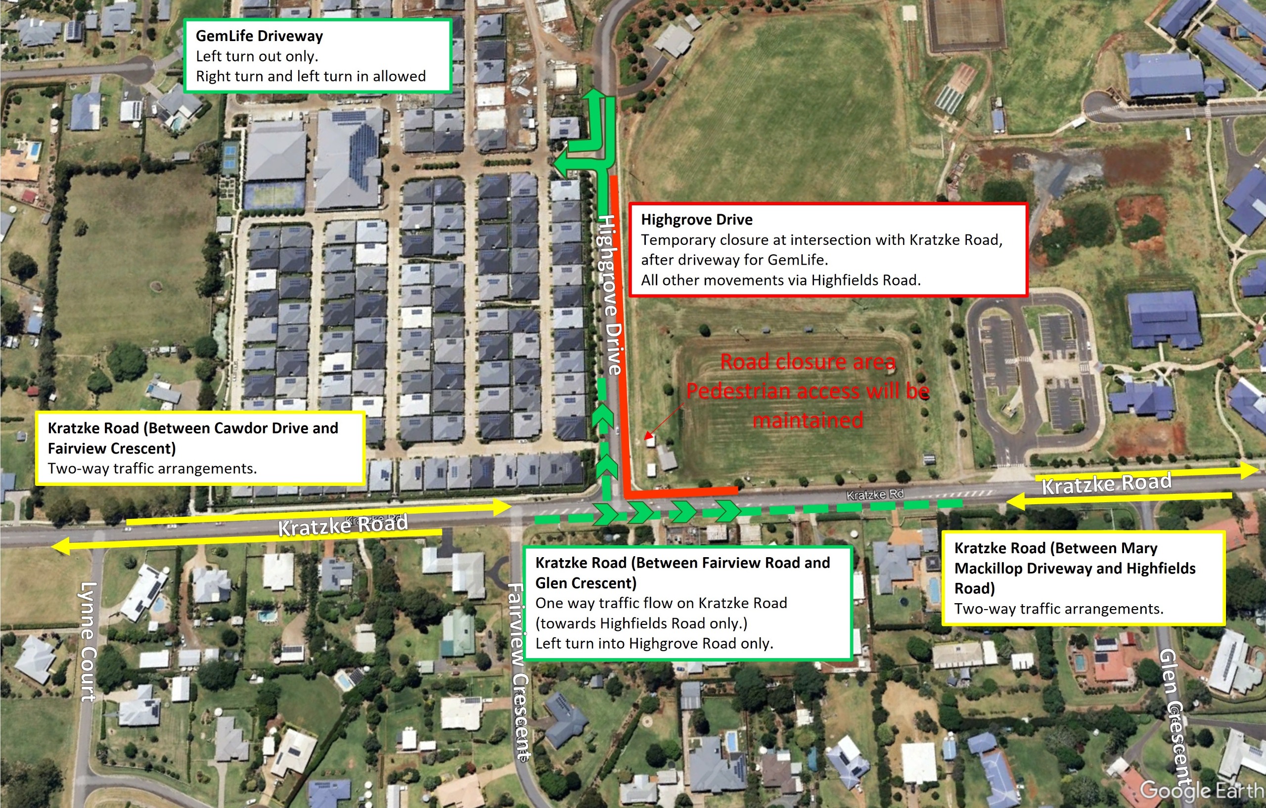 Pedestrian access at the intersection of Kratzke Road and Highgrove Drive will be maintained.