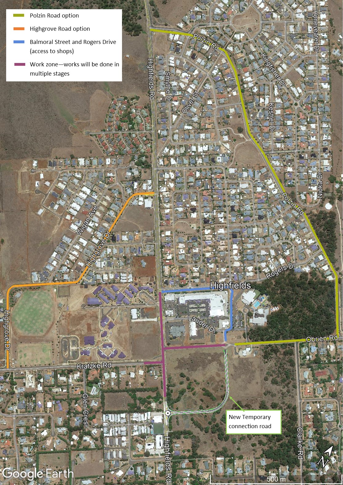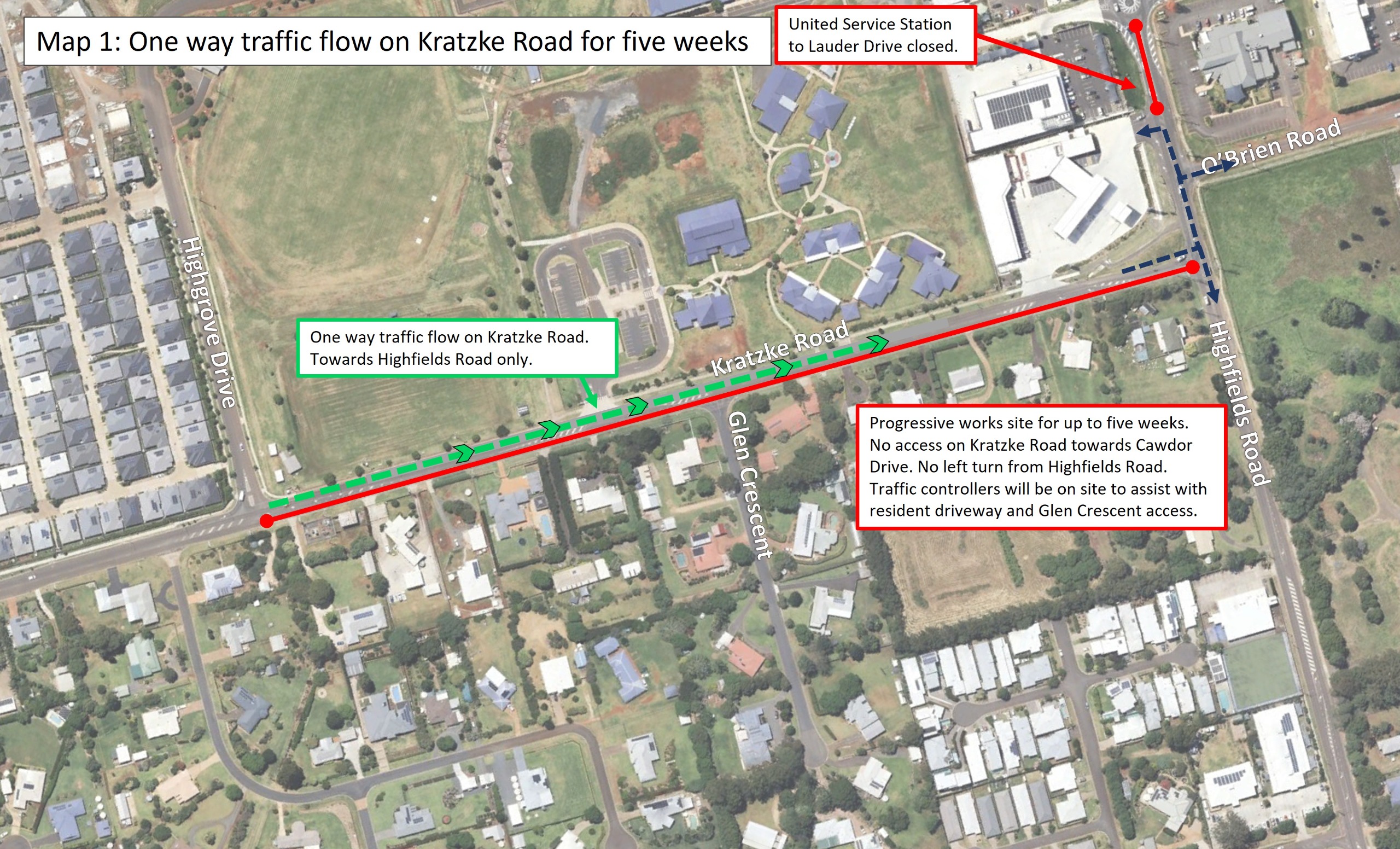 During these works, traffic will be moved on to the temporary access road between Highfields Road and O’Brien Road or the Highgrove Road detour. Local access along Kratzke Road to the Mary Mackillop School driveway, the United Service Station and businesses in this property will be maintained (via the Highgrove Road detour). See detour map link below.