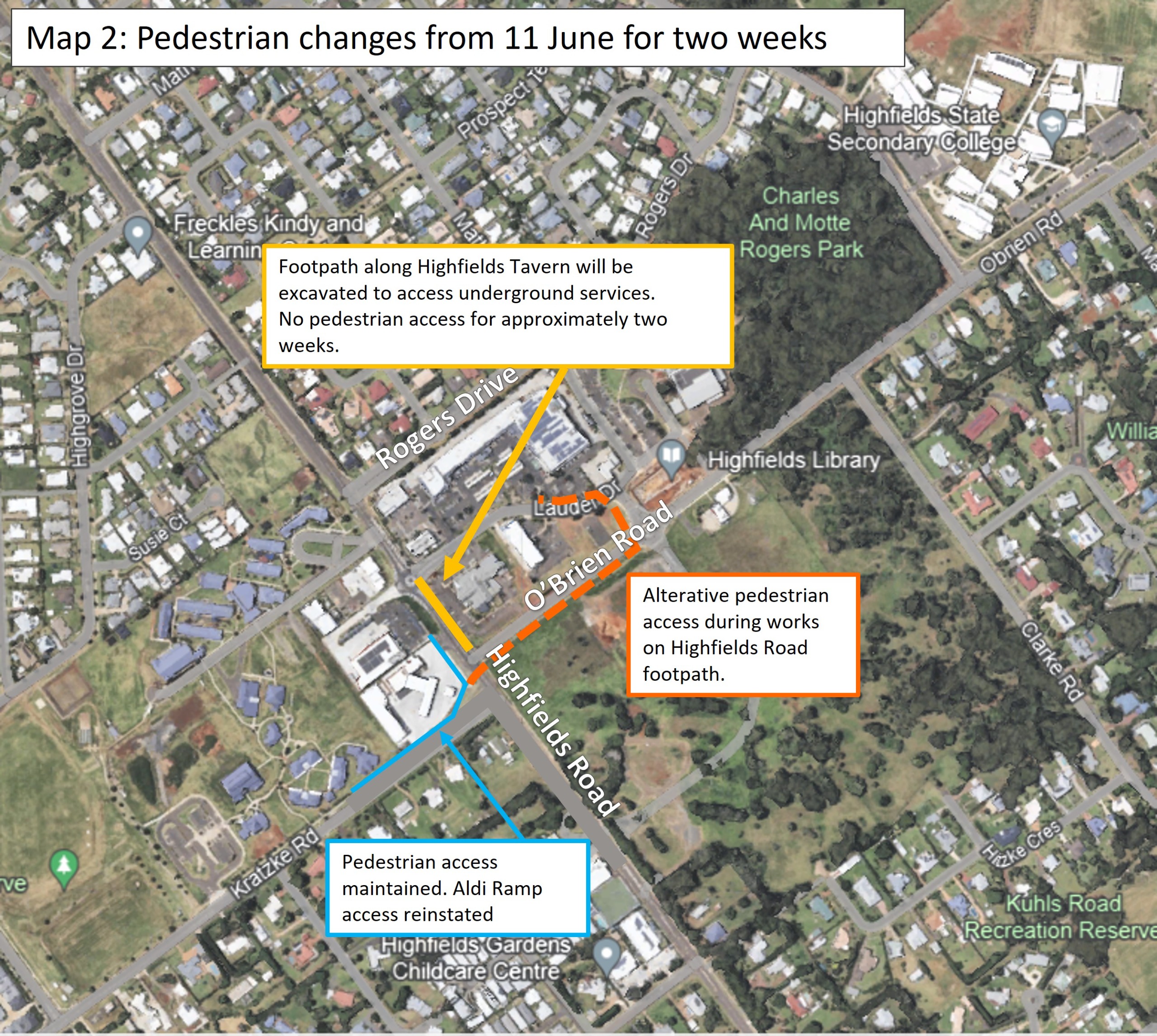 - O'Brien Road (from Tavern Bottle shop driveway to the roundabout at the Highfields Library). Access on O’Brien Road between the Highfields Tavern driveway and Highfields Road will be available.
